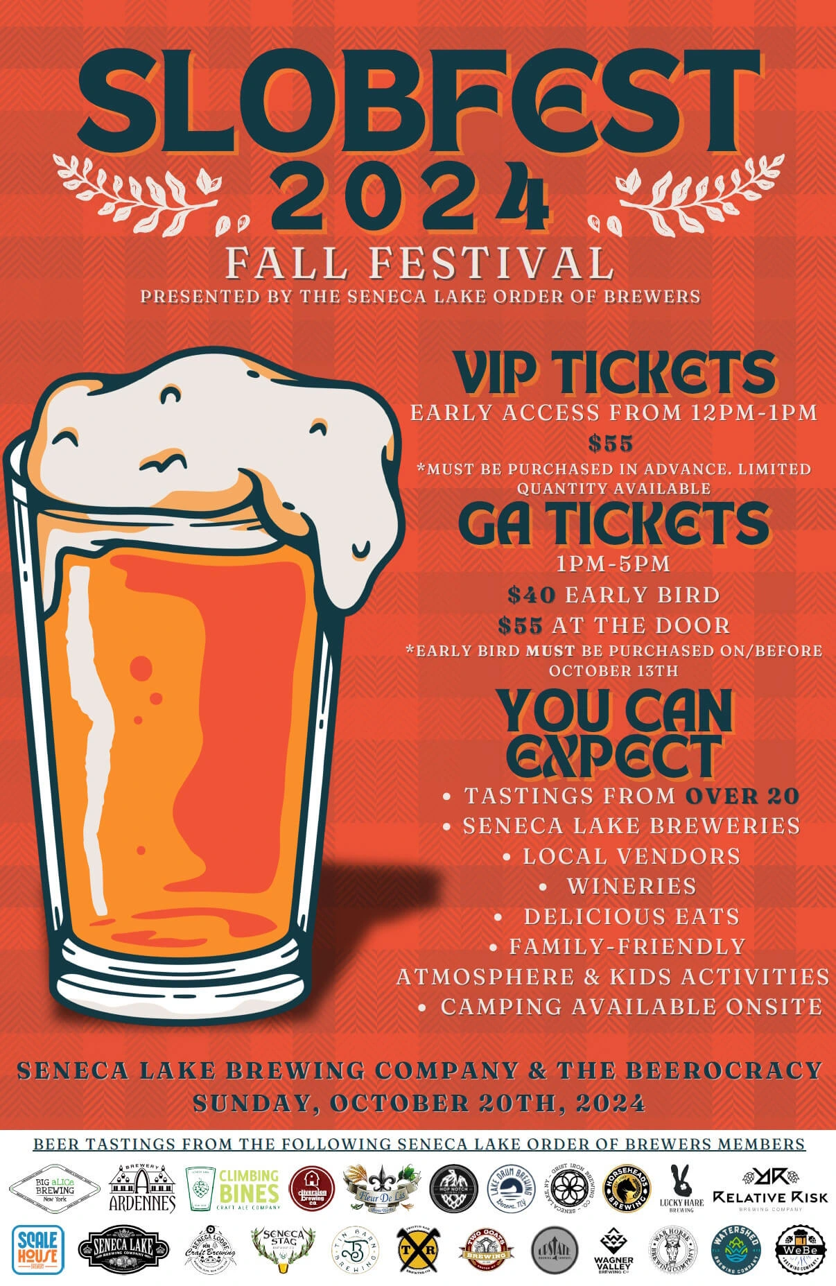 The Seneca Lake Order of Brewers are coming together to delight you with their beers and cheers! Join us on Sunday, October 20th 2024 as over 20 of the breweries from around Seneca Lake come together at Seneca Lake Brewing Company & The Beerocracy to host their annual SLOBFEST.